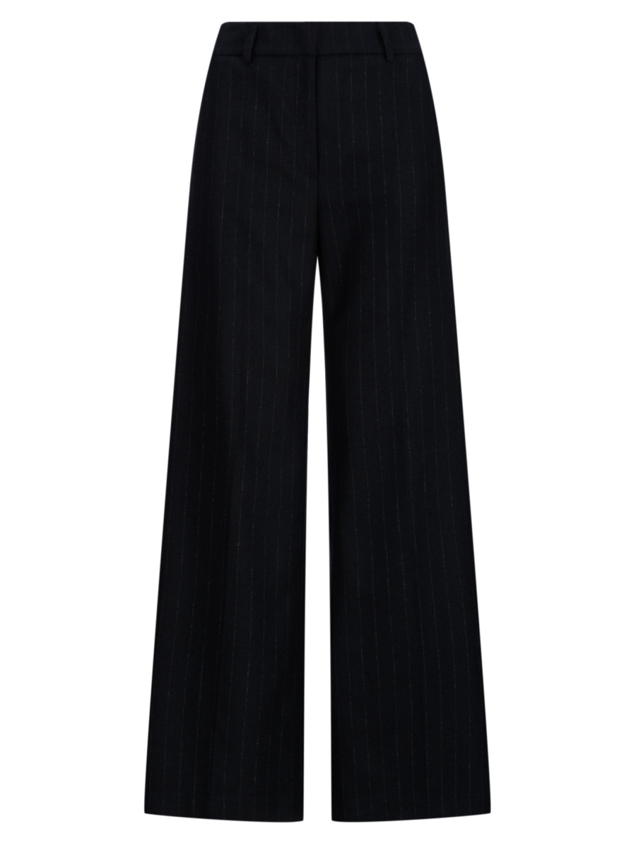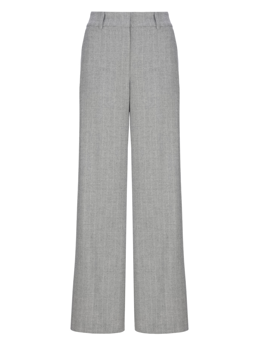 Брюки-палаццо в тонкую полоску. Модель выполнена из смеси шерсти с полиэстером, дополненной вискозой, полиамидом и небольшим процентом эластана. Данный состав обеспечивает сохранность формы, эластичность и идеальную посадку по фигуре. Преобладание натуральной шерсти гарантирует превосходные теплоизоляционные характеристики и высокий уровень воздухопроницаемости, а синтетические компоненты отвечают за устойчивость и предотвращают излишнее пиллингование. Данная модель прекрасно впишется в лаконичную офисную базу.