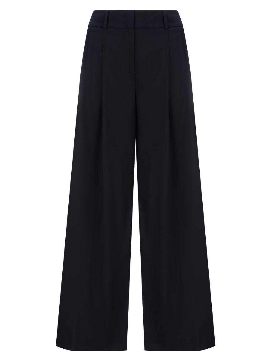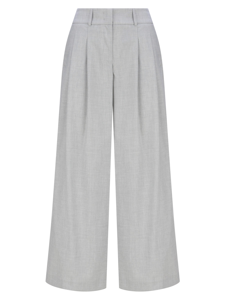 Брюки-палаццо с двумя защипами. Модель выполнена из смеси полиэстера с вискозой, дополненной небольшим процентом эластана. Модель выполнена из смеси полиэстера с вискозой и небольшим процентом эластана. Благодаря преобладанию синтетических компонентов, изделие прекрасно держит форму, практически не мнется и устойчиво к попаданию влаги. Лаконичный силуэт и базовый светло-серый оттенок с легкой меланжевой фактурой идеально подойдут как для непринужденных городских аутфитов, так и для офисной базы.
