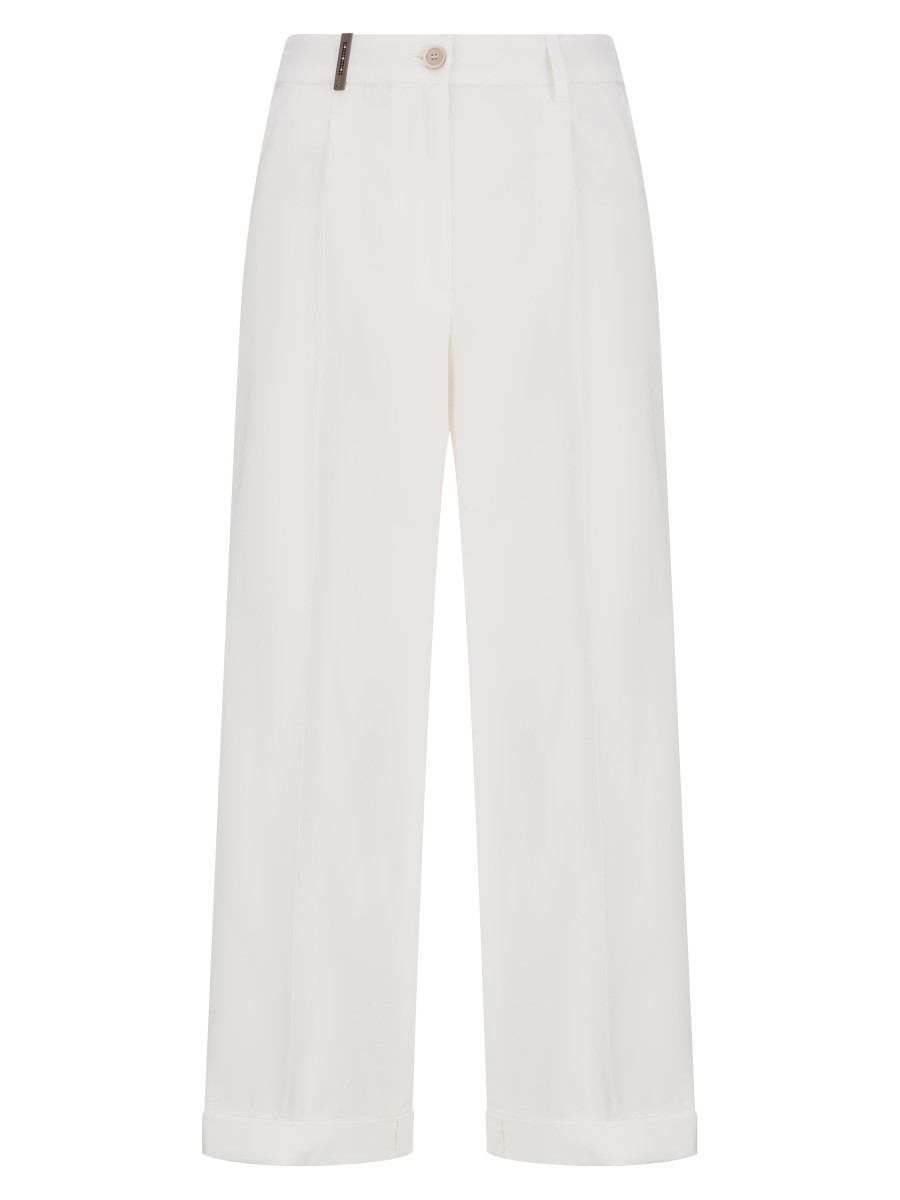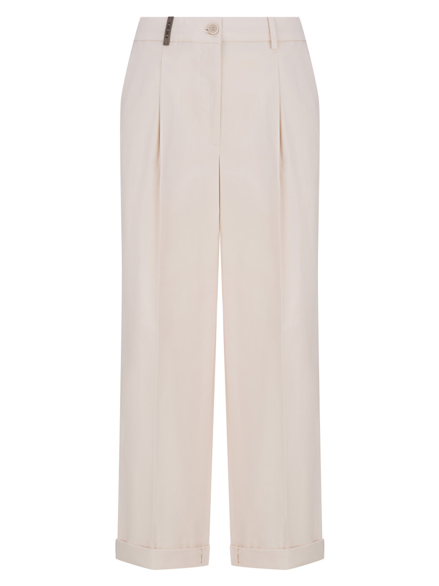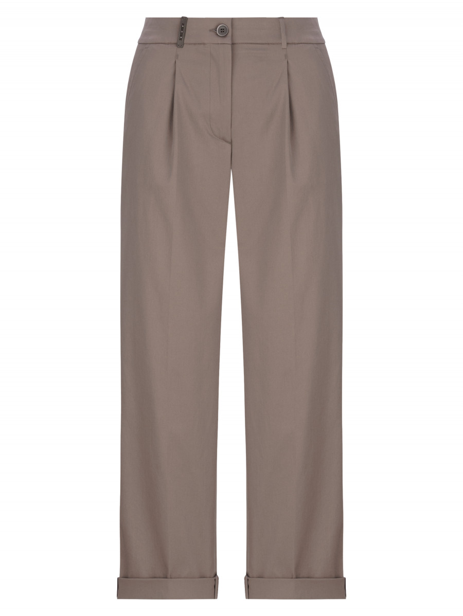 Прямые брюки с отворотами и защипом. Модель выполнена из хлопка с добавлением небольшого процента эластана. Сочетание органического хлопка с синтетическим компонентом позволяет изделию лучше держать форму, за счет чего брюки меньше мнутся и не растягиваются в процессе эксплуатации. Прямой крой подойдет для любого типа фигуры. Модель выполнена в нейтральном светло-бежевом оттенке, что позволяет задействовать брюки как в расслабленных городских аутфитах, так и в лаконичной офисной базе.
