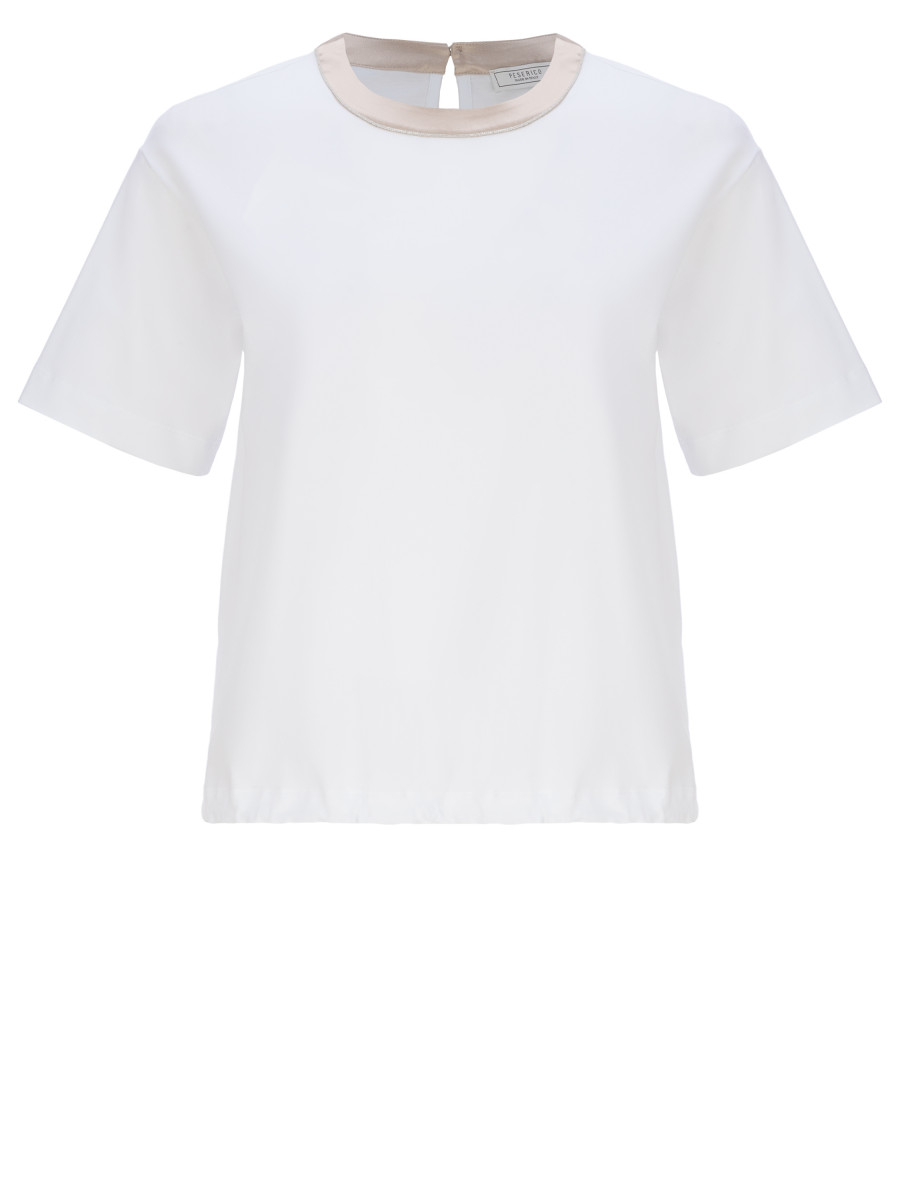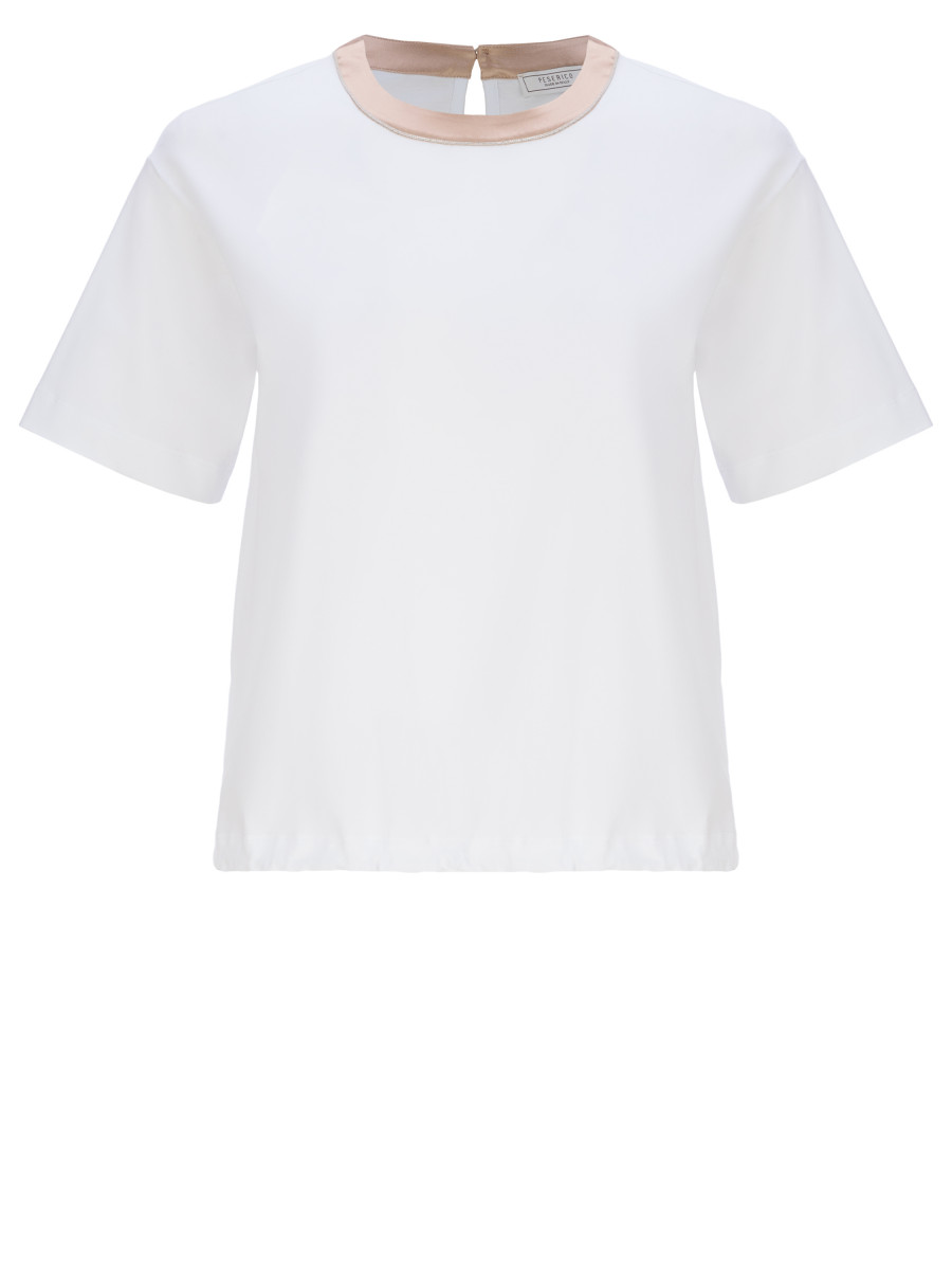 Футболка с круглым вырезом и кулиской на нижней части. Изделие изготовлено из мягкого органического хлопка, дополненного небольшим процентом эластана. Данный состав гарантирует не только комфорт в жаркую погоду, но и легкость в уходе. Свободный oversize силуэт и базовый белый цвет помогут вписать изделие в неформальные, расслабленные casual аутфиты. Нижняя часть футболки дополнена кулиской, что позволяет регулировать плотность прилегания к телу. Ворот декорирован полоской из смеси шёлка с эластаном и тонкими латунными цепочками, расположенными по краю.