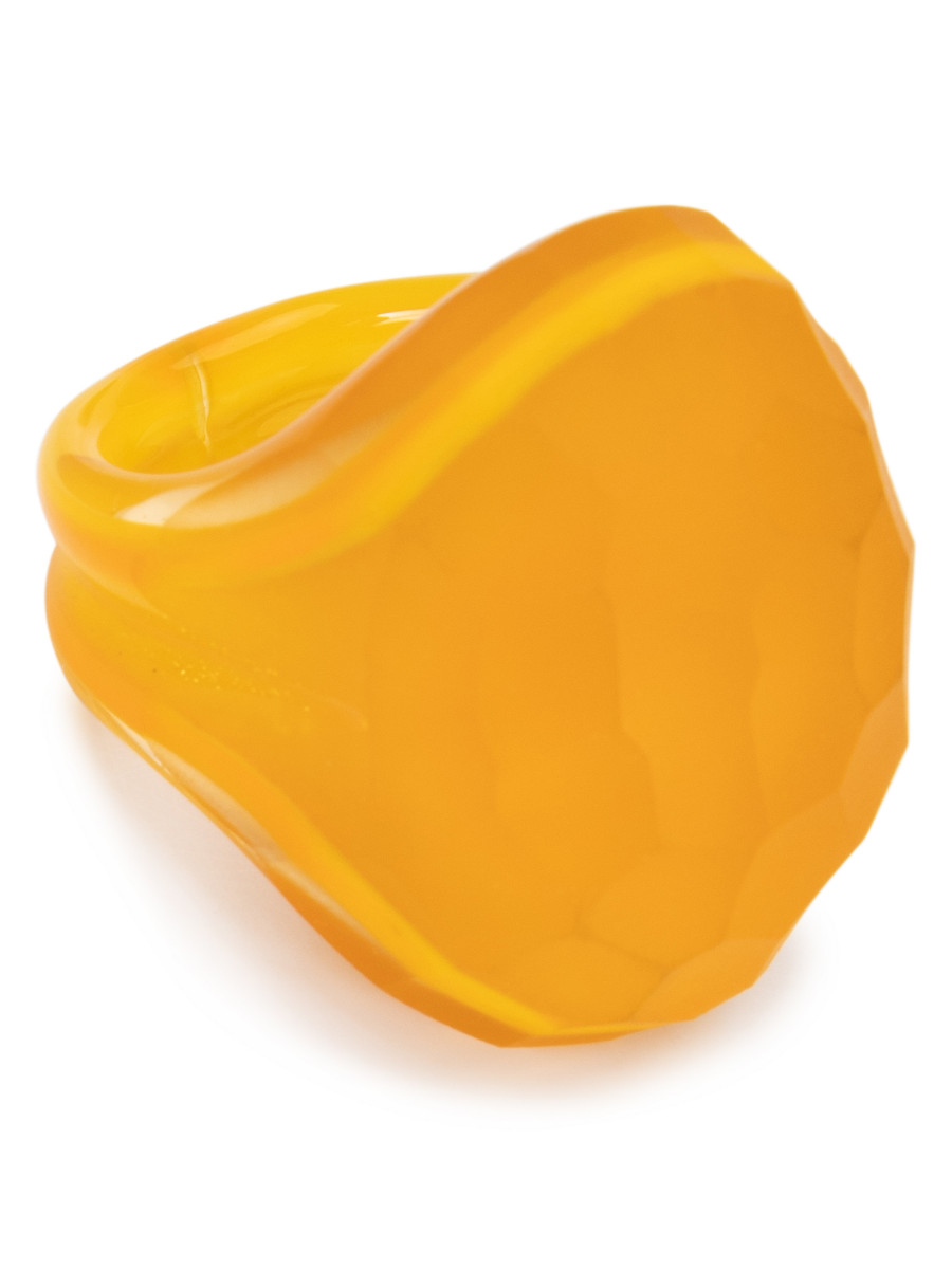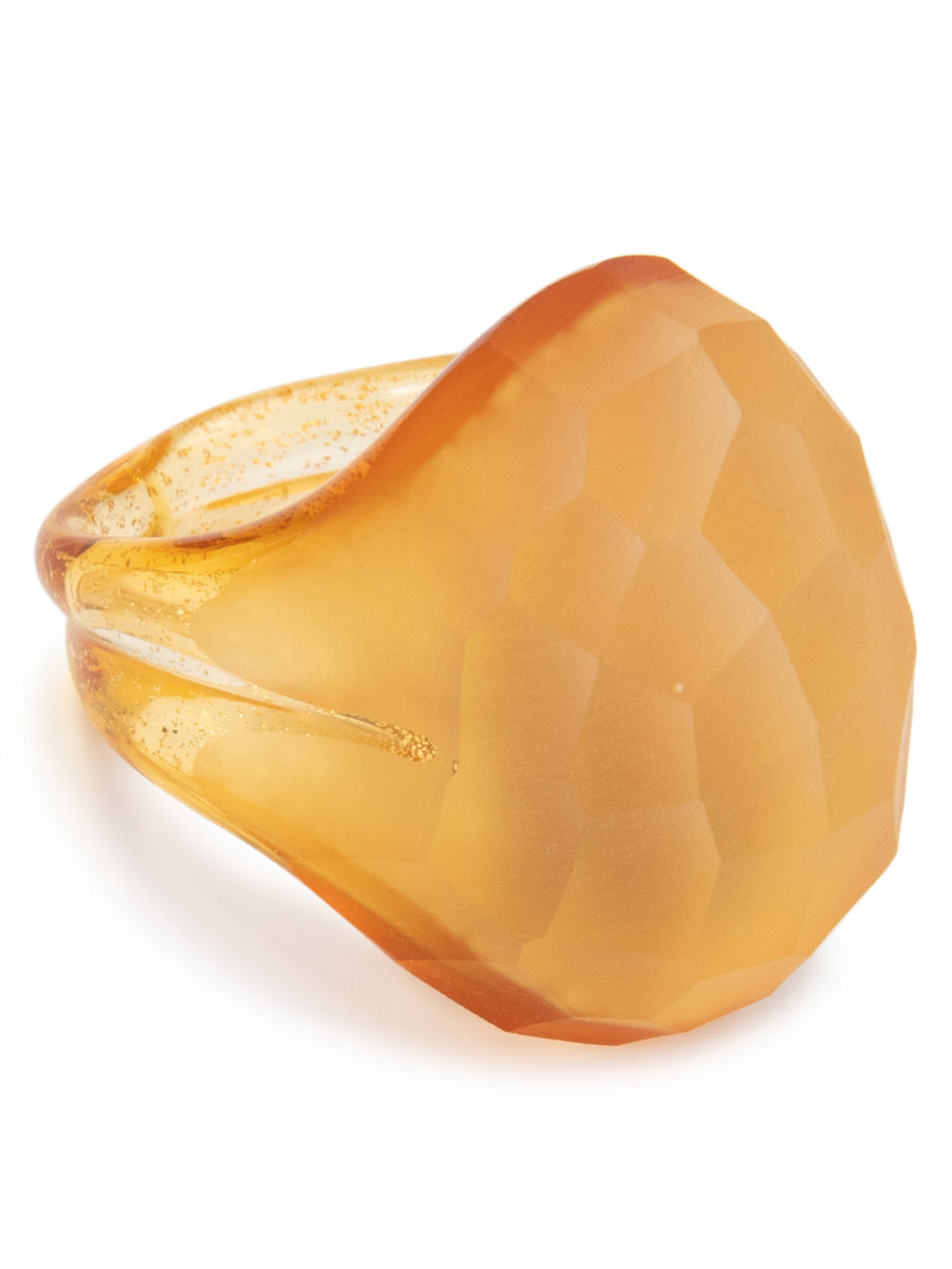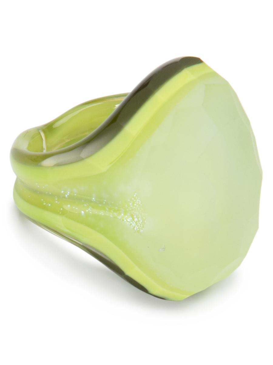 Граненое кольцо из муранского стекла с матовым покрытием. Главный секрет мастеров-стеклодувов с острова Мурано — ручная работа, никакой автоматизации. Муранское стекло имеет сотни разных цветов и оттенков. Каждая мастерская старается создать свой цвет, а рецепт его приготовления держит в тайне, поэтому каждое изделие получается поистине уникальным и неповторимым. Фактурное кольцо в салатово-зеленом оттенке представлено в трех размерах – G (Grande) - большой, M (Medio) - средний, P (Piccolo) – маленький.